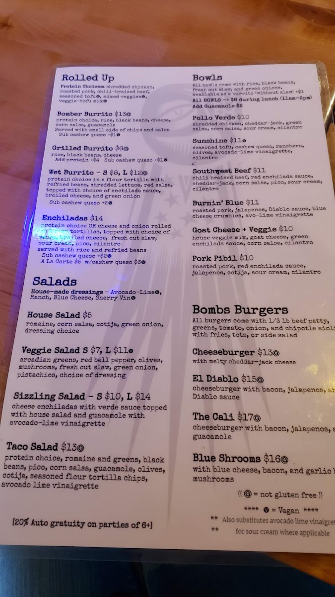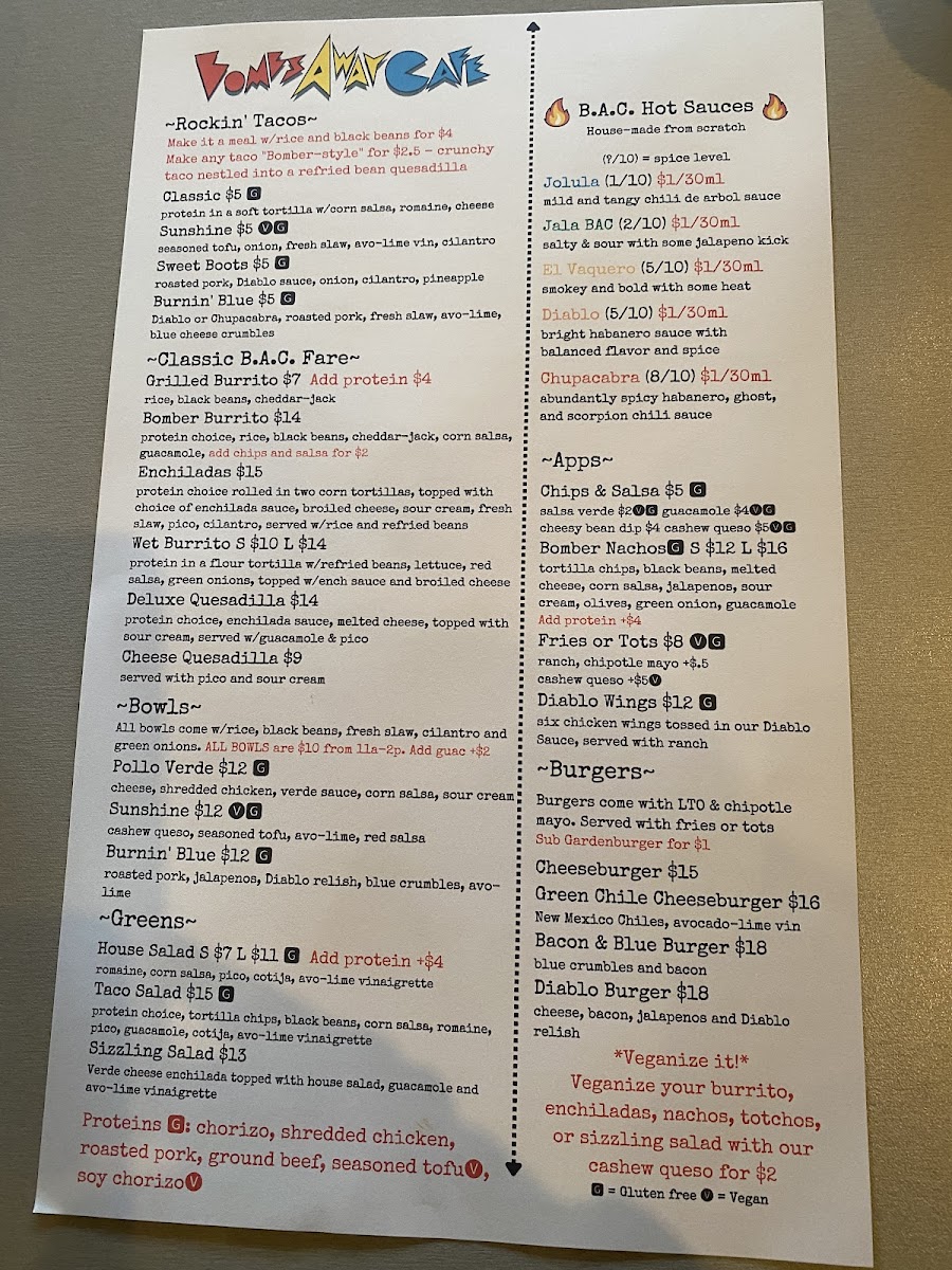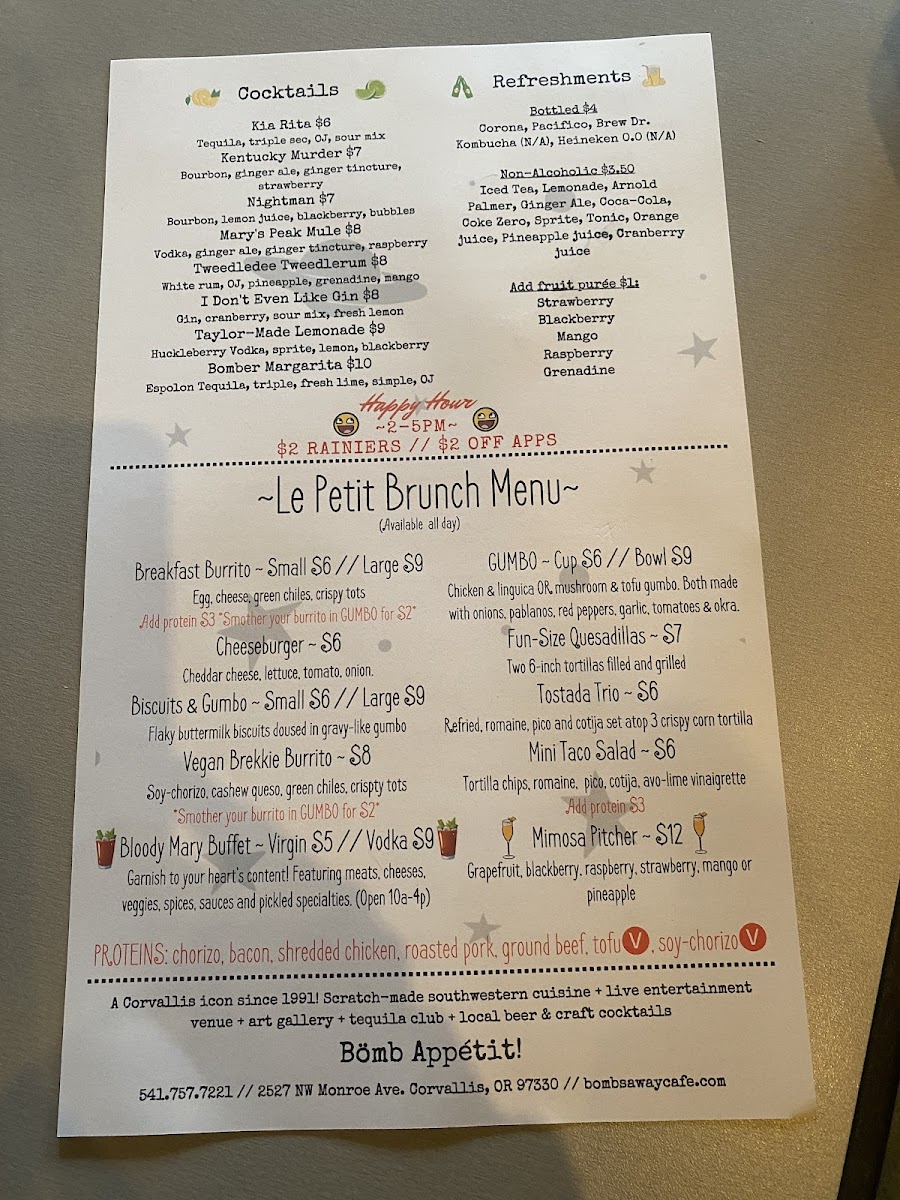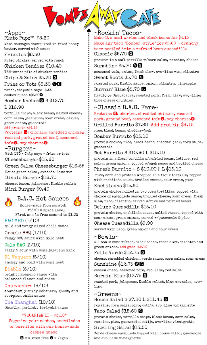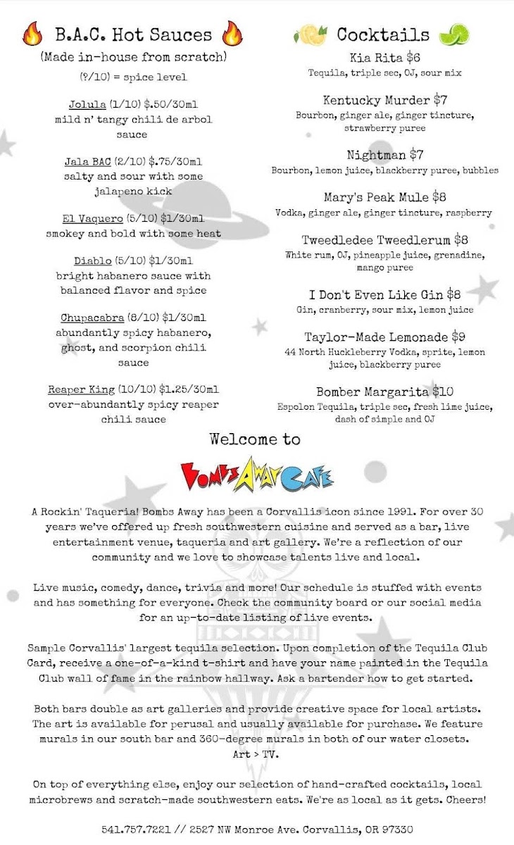 Welcome to Bombs Away Cafe - A Rockin' Taqueria, where vibrant flavors meet a lively atmosphere in Corvallis! Dive into a culinary adventure anchored by traditional Mexican fare reimagined with a rock 'n' roll twist. The menu features mouthwatering choices, from the satisfying Grilled Burrito bursting with rice and black beans, to the bold Diablo Burger, layered with cheese, bacon, and jalapeños. For a sweet finish, indulge in their delightful Cheesecake Tacos or the crispy Horchata Bites.